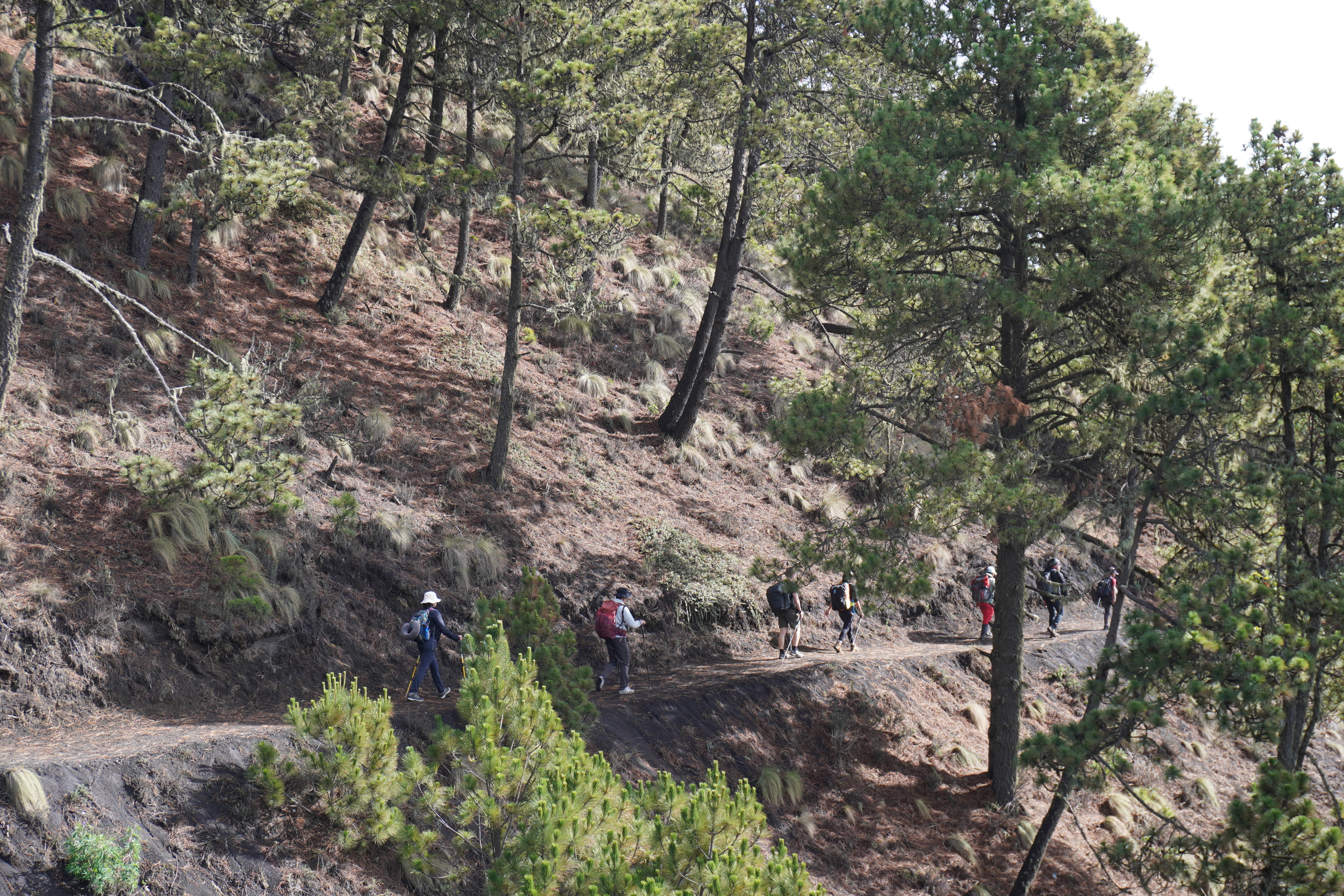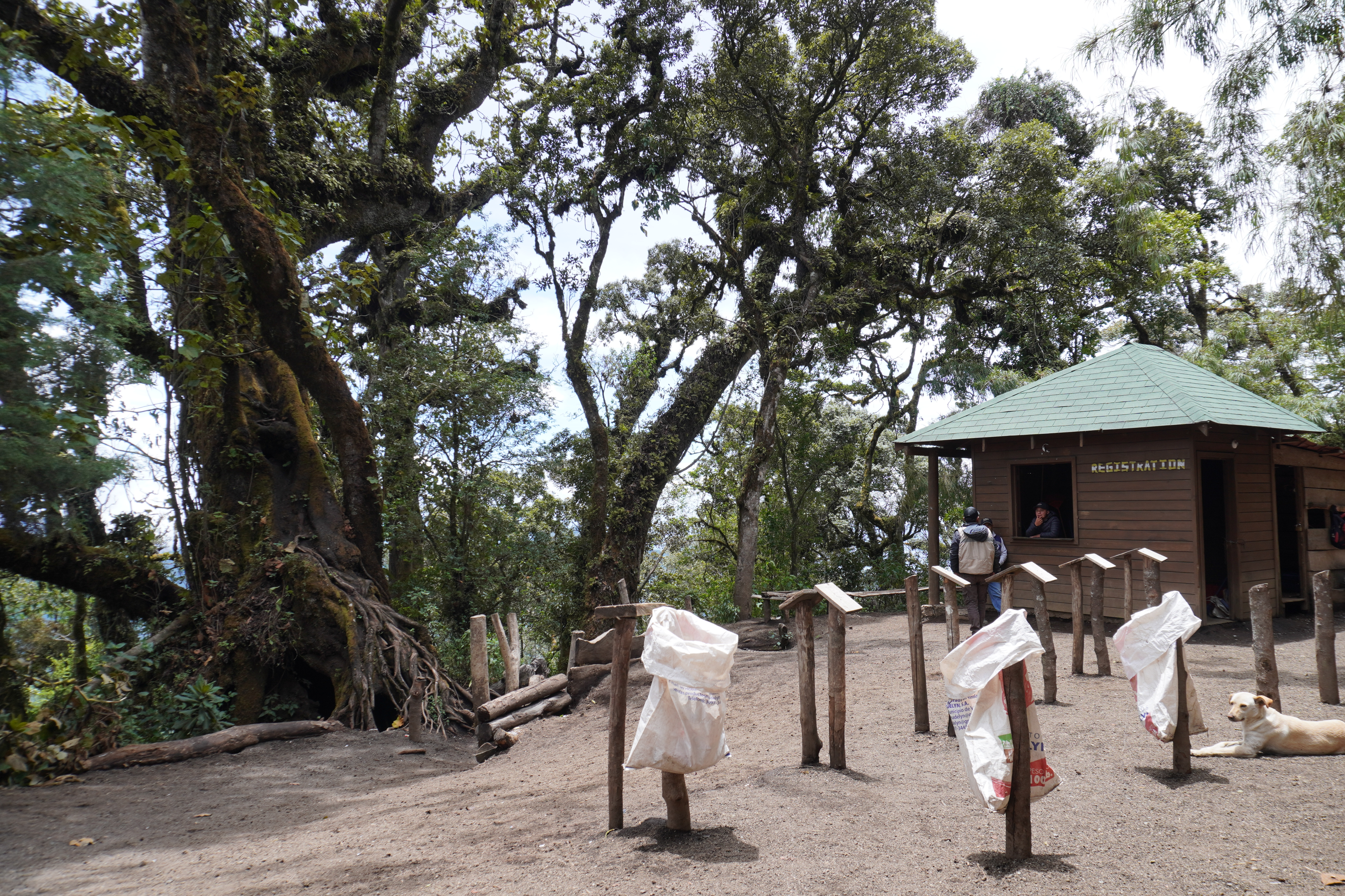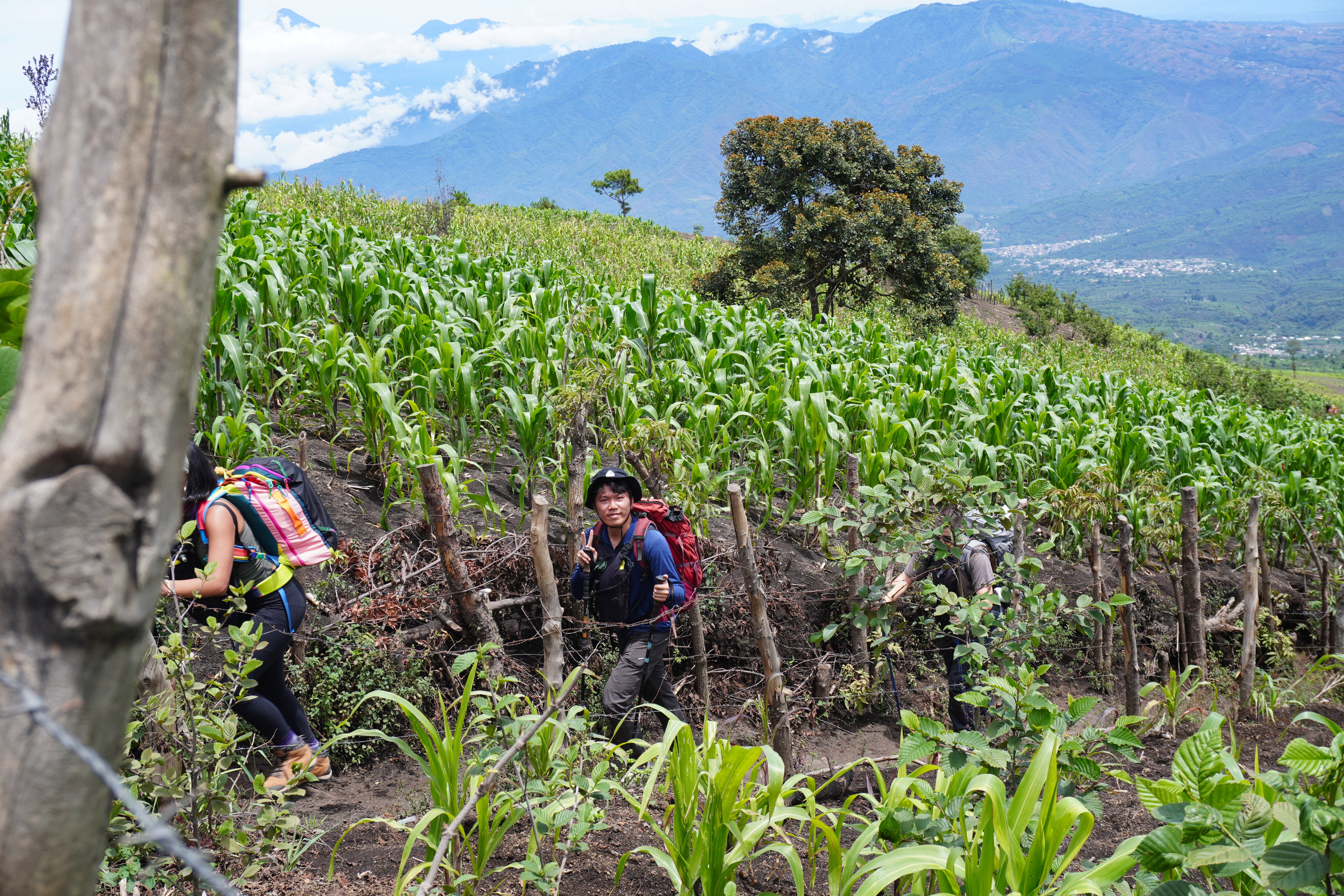 搭車的終點也是整個路線上坡路段的終點,在這裡原本可以毫無障礙的眺望水火山Volcán de agua,可惜這天雲太多被遮住了,從這裡再走45分鐘就可以抵達過夜營地,接下來的路程都很平緩,不太費體力。