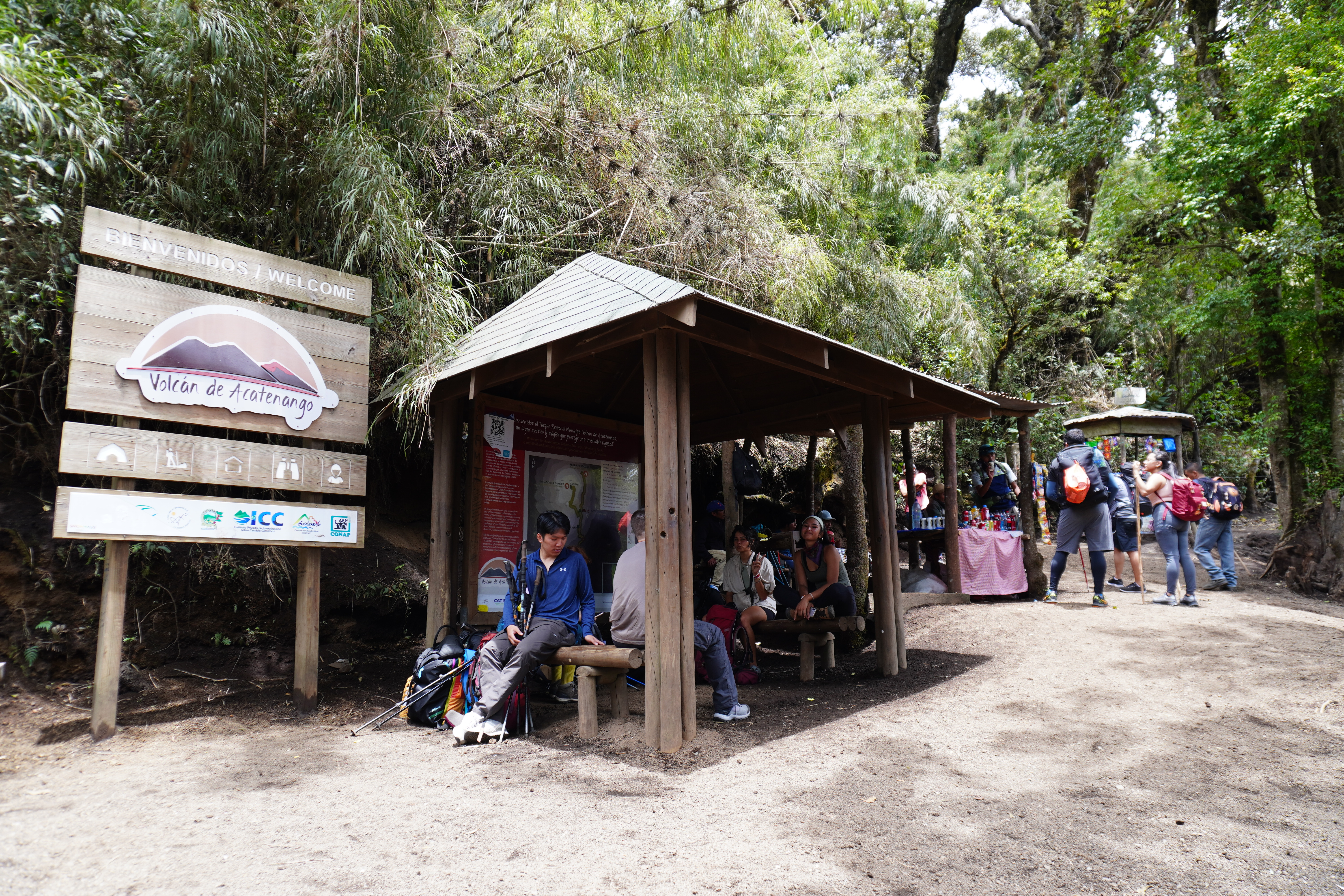 抵達登山口,這邊沒有廁所只能大自然解放囉!登山杖在登山口租,有專業登山杖及簡易版木棍,專業版一對是50Q,木棍好像是一半的價錢(或是更便宜,忘了XD),強烈建議一定要租,登山過程幾乎都是火山砂石,土質很鬆不好走,有了登山杖的幫忙可以省一點力。