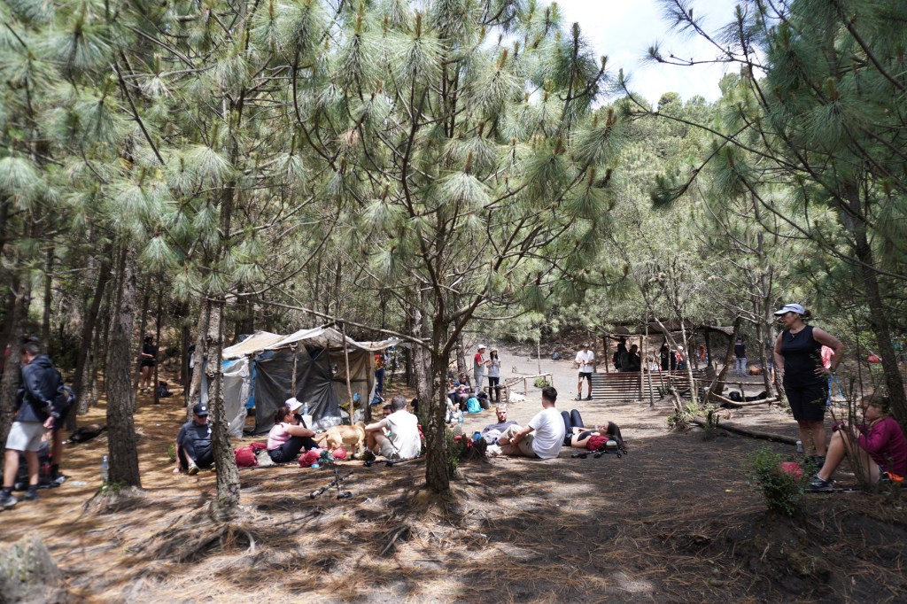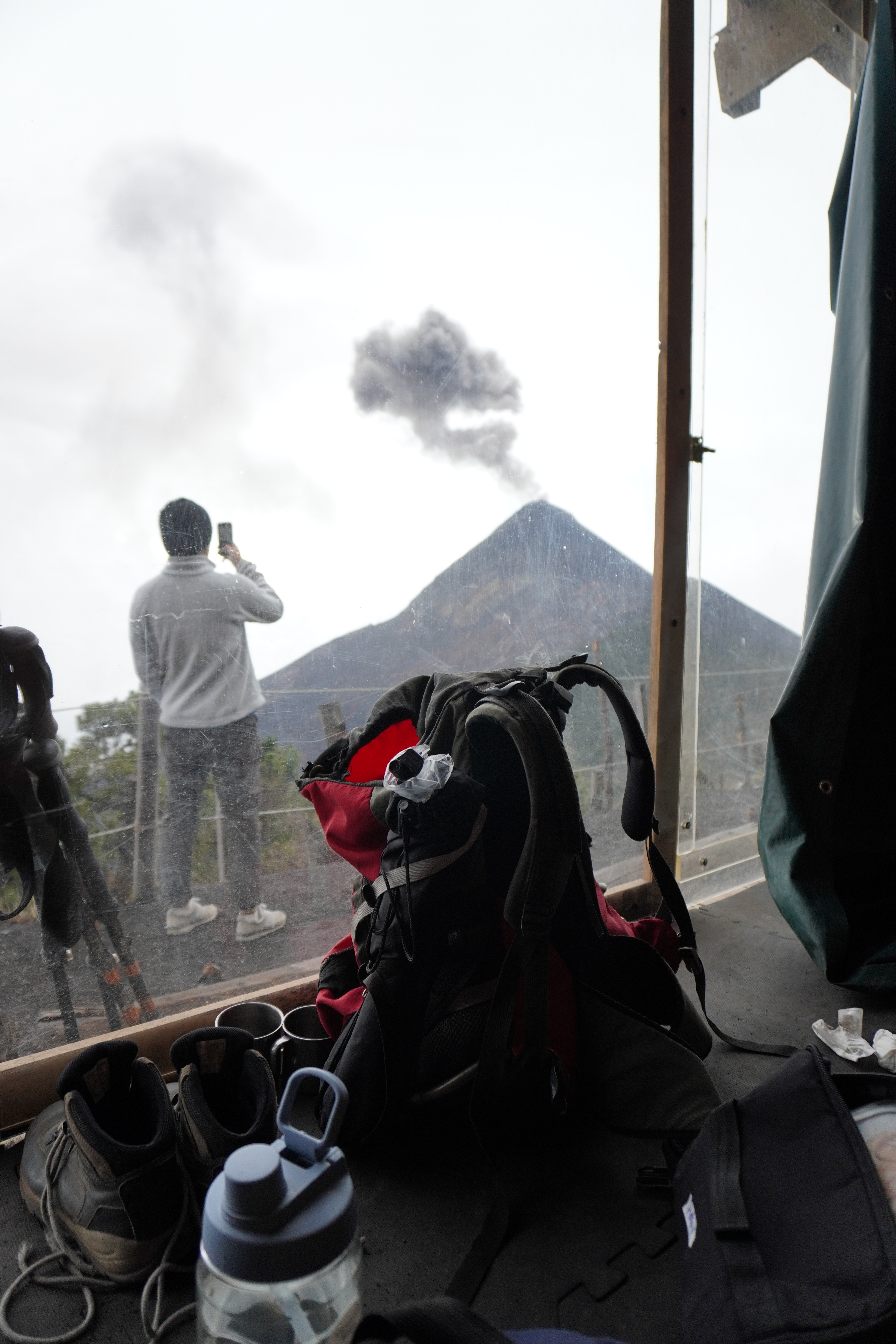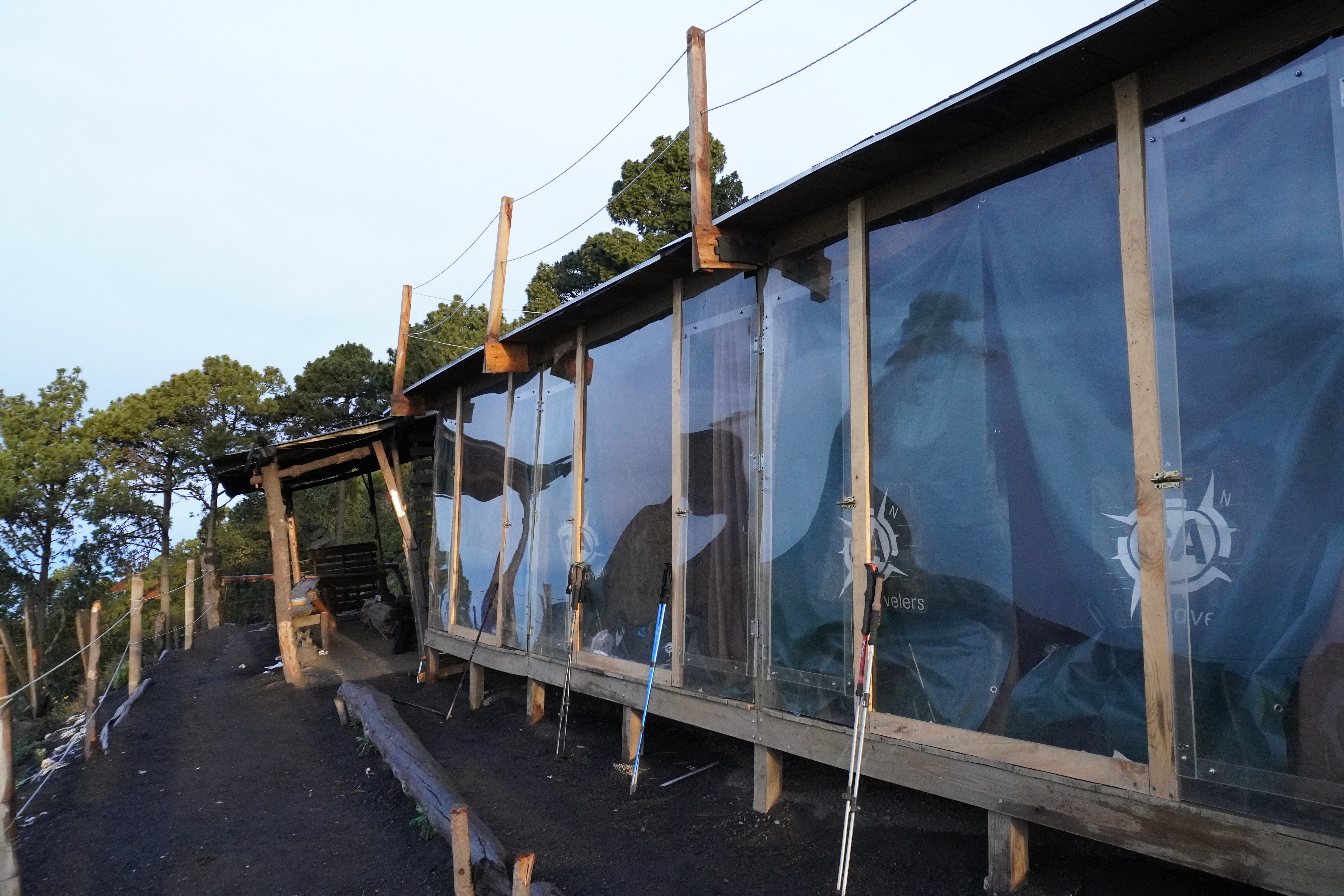 我們大約在15:52抵達營地,包含休息時間總共花費5個小時15分鐘。CA的營地位於海拔3600米的高度,直接面對Fuego火山,山景第一排!每一間艙房最多只會睡兩個人(一人一張床墊),還算寬敞,全透明的前門在房間裡就看得到Volcán de Fuego,艙房裡有睡墊、睡袋、枕頭、小掛燈,如果覺得太冷可以再蓋自己背上來的毯子。