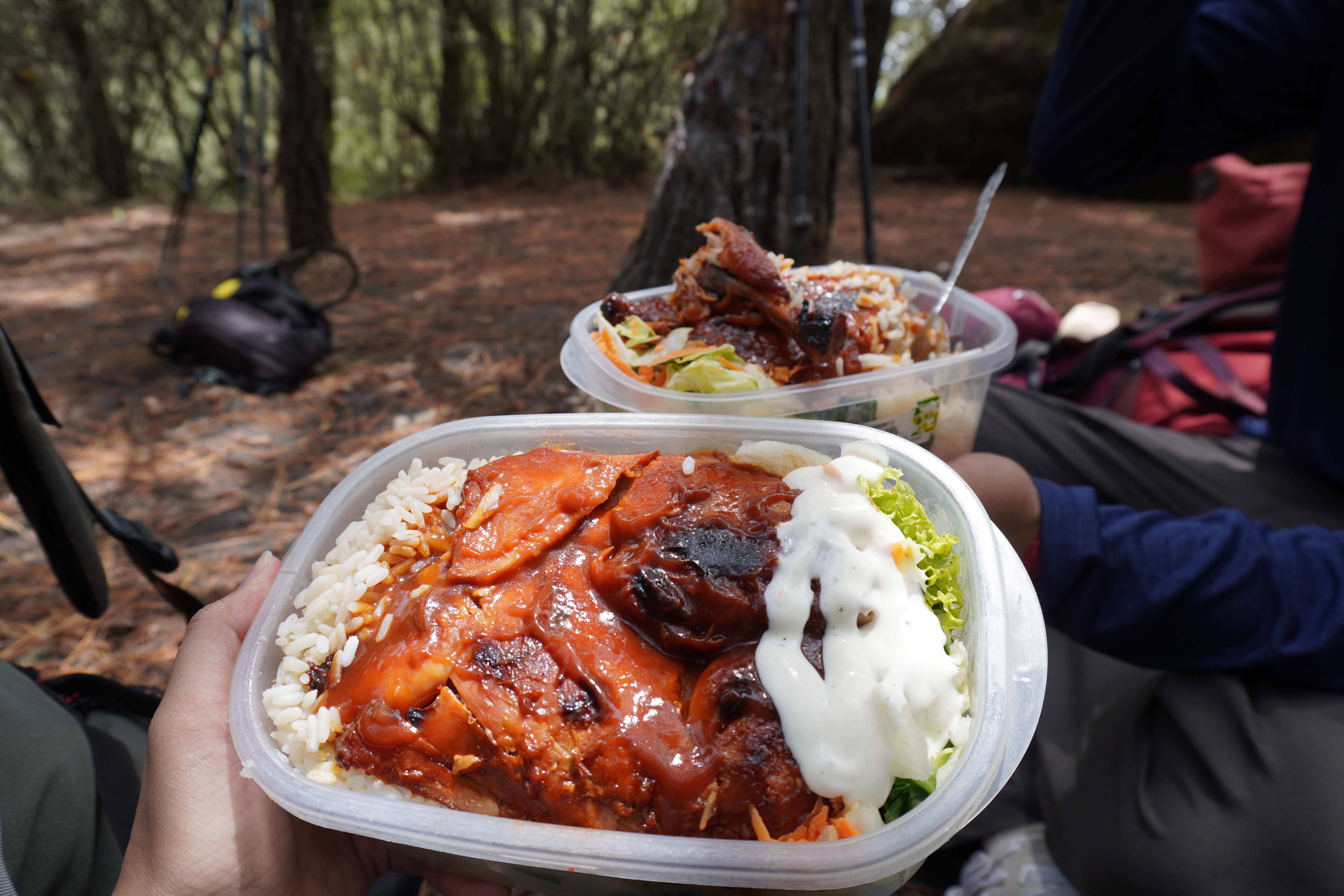 終於來到午餐時光,各家旅行團各自找空位席地而坐,這便當真的滿厲害的,照燒雞肉超級大塊,還有滿滿的生菜,這份量全團的人都說太多了XD(真的很怕客人餓到)但能在山上吃到這個真的很幸福~用餐過程會有很多隻狗狗虎視眈眈,最後吃不完的就集中倒在旁邊的空地上,會成為狗狗們的豐盛午餐,所以不用怕浪費或是繼續背著佔一份重量,吃不下的就給狗狗吧!