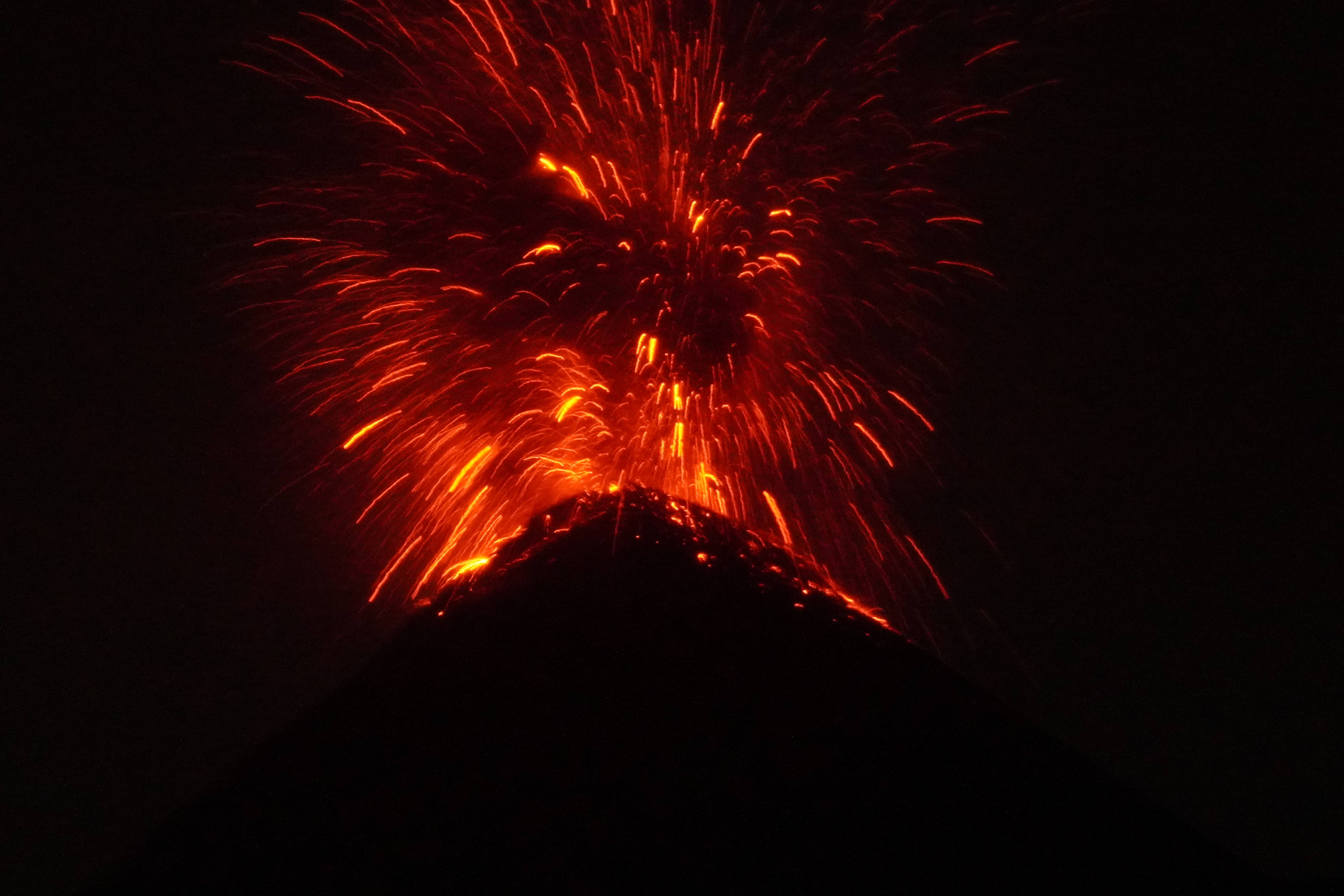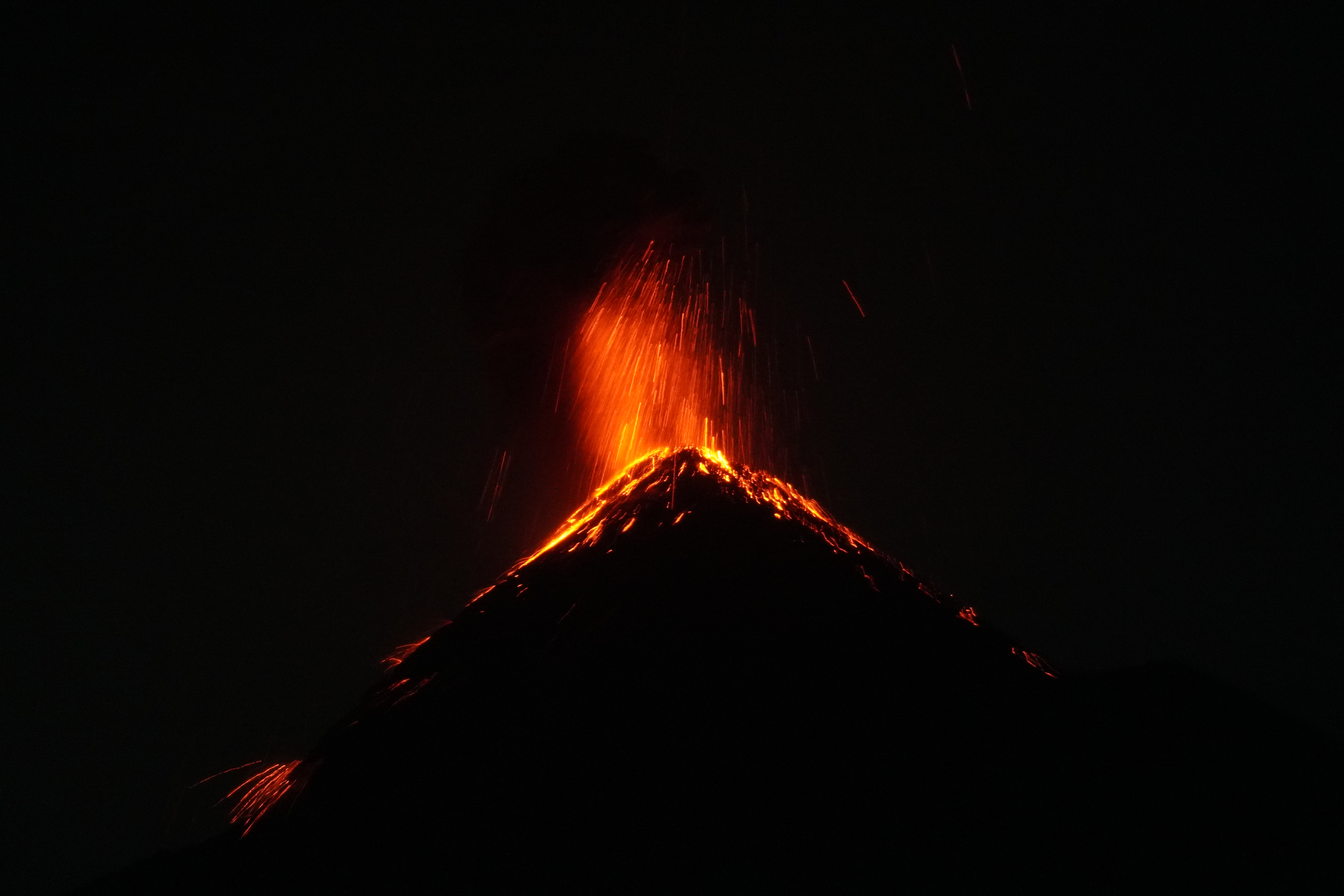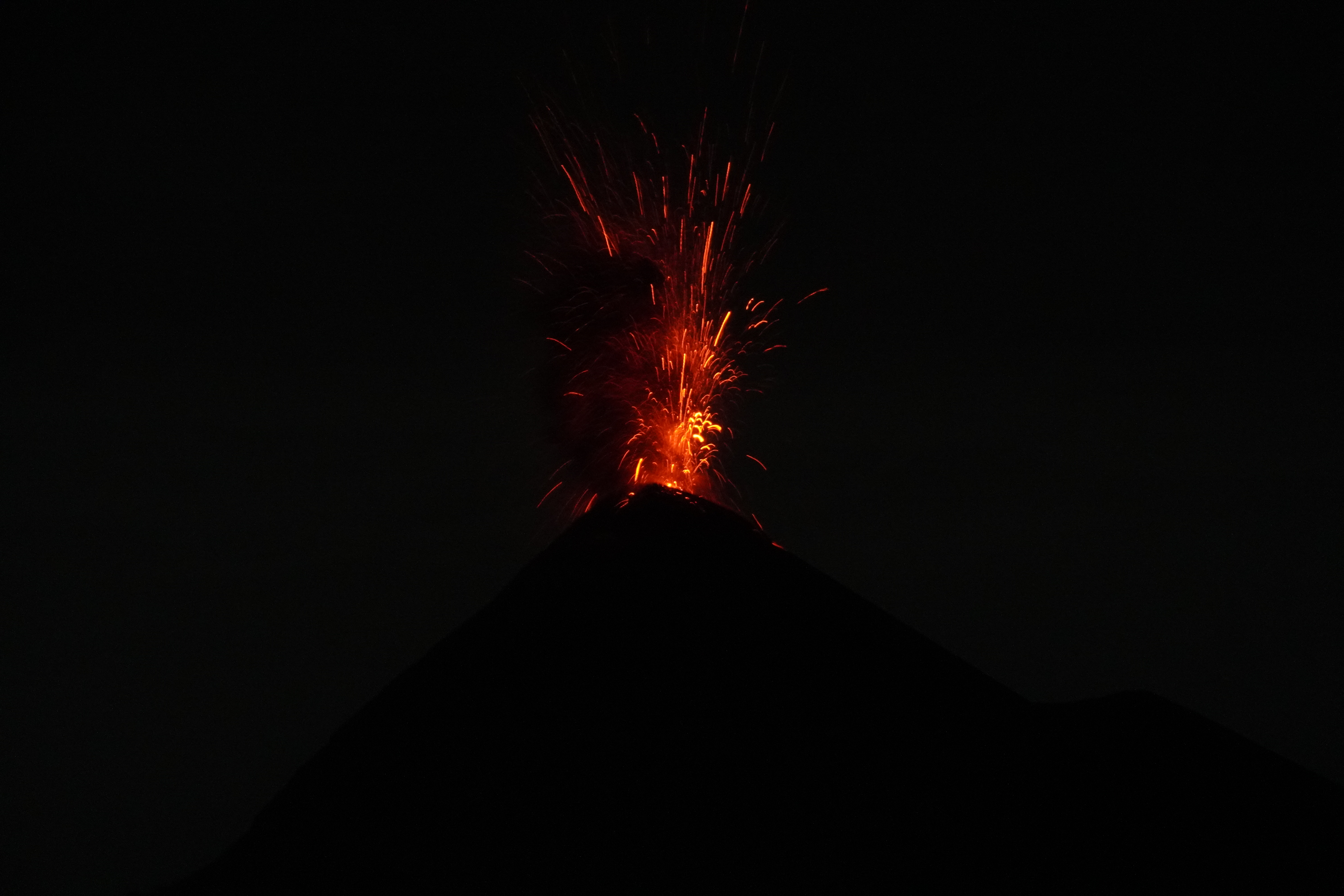 此行重頭戲就在入夜後的噴發,這也是Acatenango行程如此熱門的原因,在一片漆黑之中,首先會聽見爆炸聲響前兆,接著才從山頂噴發出岩漿,閃著橘紅色的光,就像放煙火般,甚至能清楚地看見岩漿順著山壁緩緩流過,這一幕,真的太感動了!