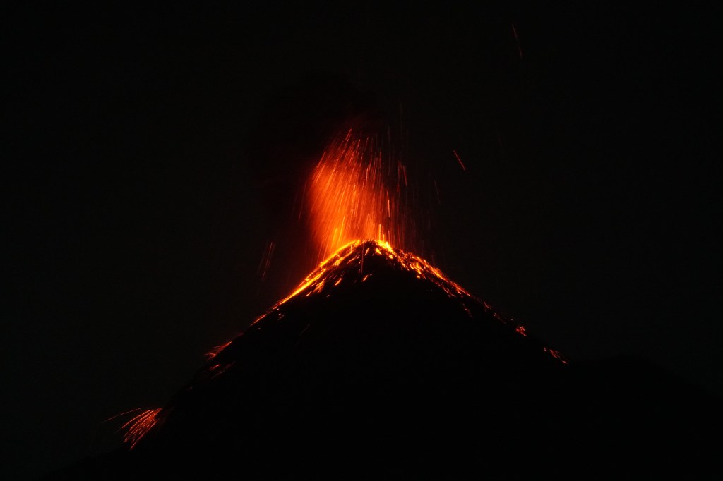 Fuego在西語意思為火,故譯為火火山,長期維持低活動度的火山爆發,平均20分鐘就會噴發一次,近期較嚴重的噴發發生在2012年及2018年,2018年的噴發為1974年來最強烈的一次,周遭170萬居民受到影響,更有數個村落因此遭到掩埋,造成許多居民傷亡。而火火山每天都在不停的小噴發,當然就不可去火火山攻頂了,這時候!他隔壁的雙胞胎Volcán de Acatenango就非常重要了(配角變主角?!XD),因為攻上Acatenango火山可以最靠近而且沒有生命危險的近距離觀賞Fuego的噴發,最令人印象深刻的畫面就是夜晚看著岩漿噴出然後緩緩沿著山壁流下,我就是衝著那個畫面才決定參加這個行程。