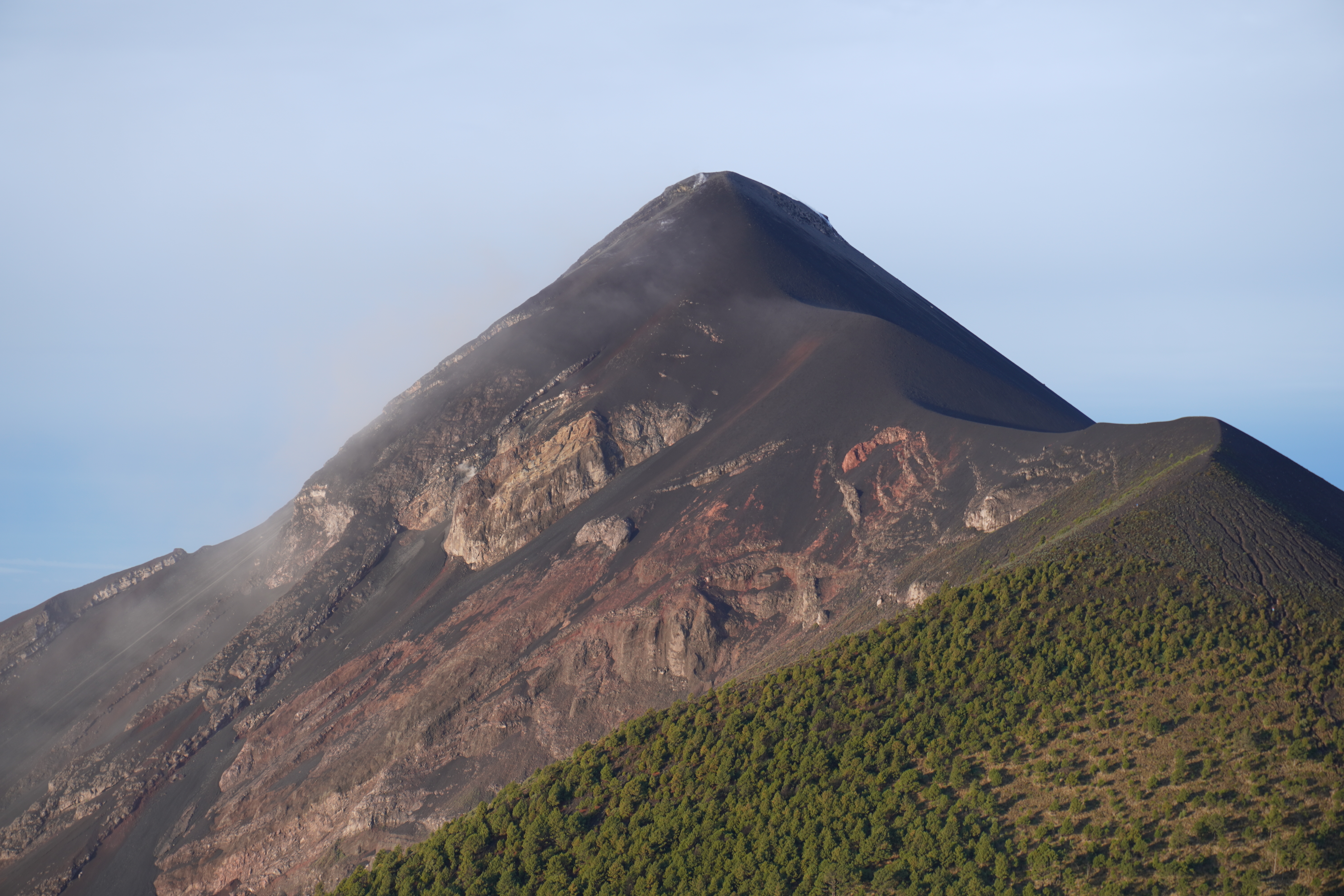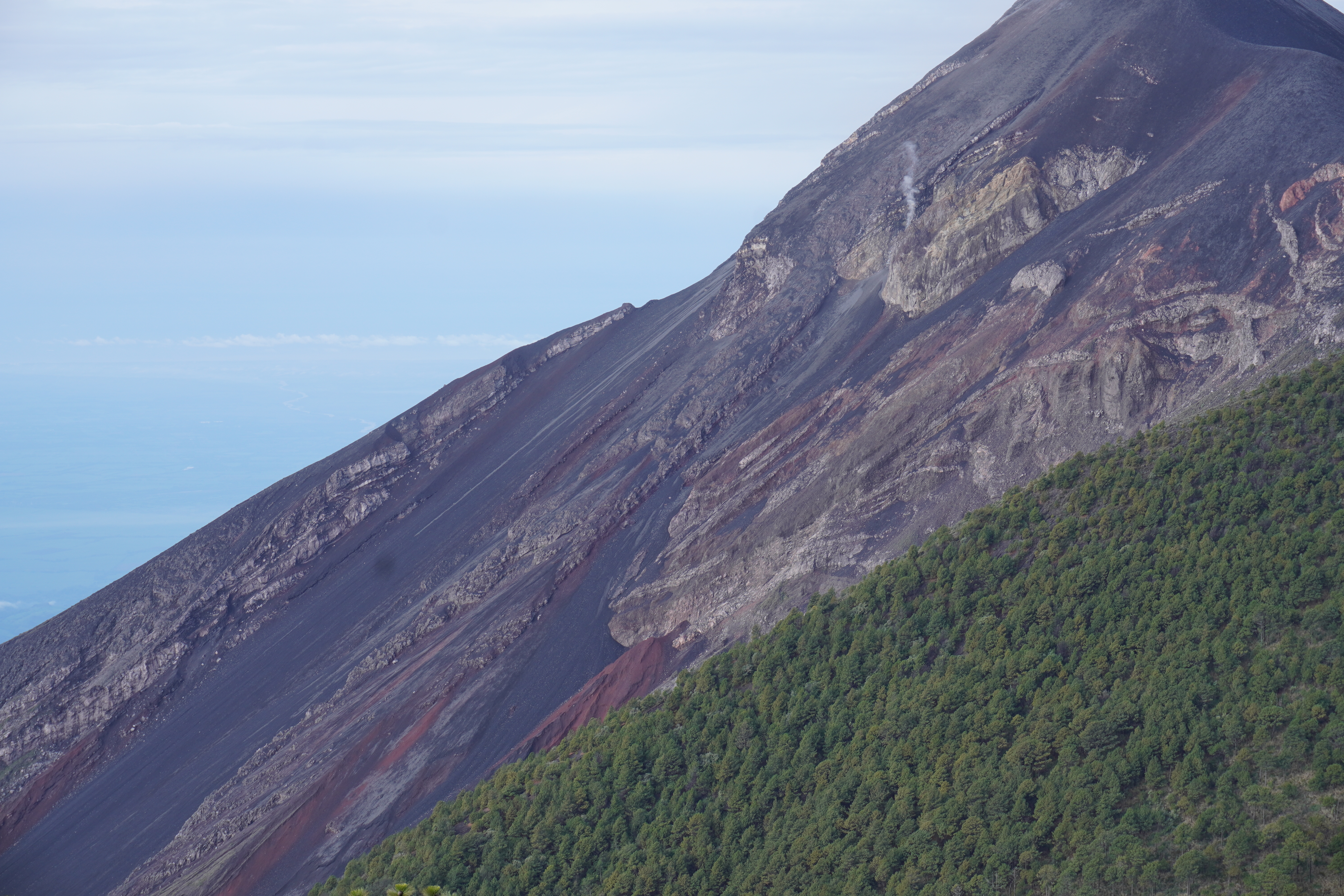 原本的行程是會早起攻上Acatenengo的山頂看日出,大約需要1.5小時,不過因為天氣不好所以嚮導並沒有帶我們攻頂,但我們還是5:15就起床了,太陽已初升在天空之中,溫暖柔和的日光照映在大地上,所見的一切都比昨日來得更佳清楚,Fuego火山被岩漿流過的山壁明顯毫無植被,與一旁的樹林對比出強烈的差異,山頭還被厚厚的火山灰給覆蓋,大自然的奧妙呀!