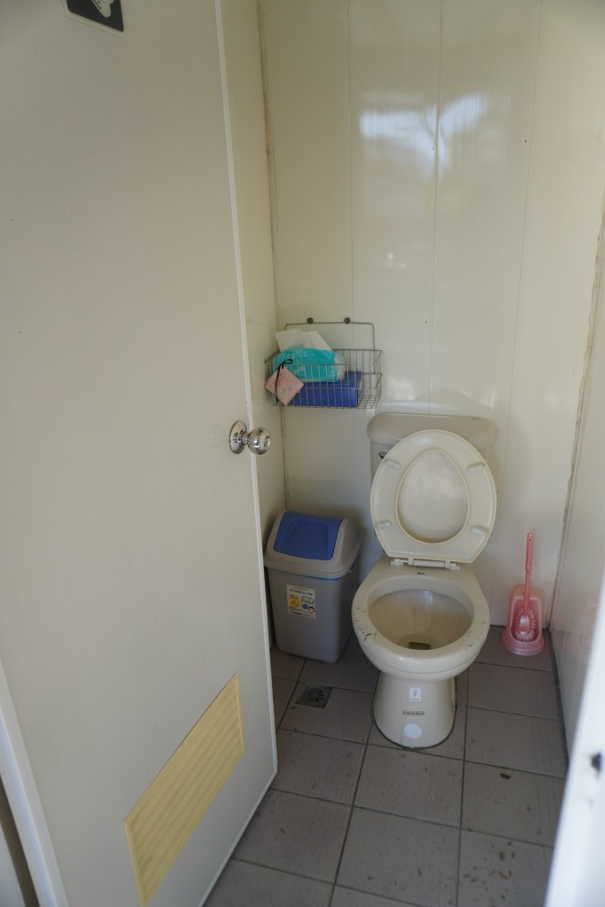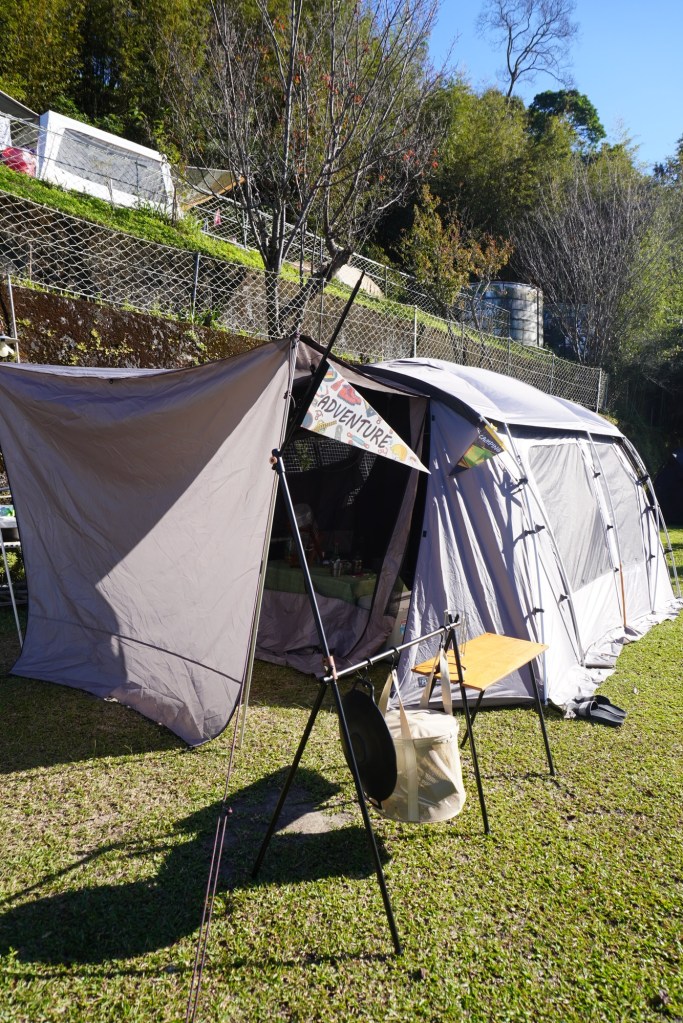 營區規劃車停在浴室旁的位置,帳篷往內側搭,營位空間不算很大,以我們住的A區來說如果要停三台車又搭三帳的話,會跟隔壁帳還滿近的,但剛好這次沒有住滿,只搭兩帳就很寬敞互不打擾,第一晚我們甚至包下整個營區XD 剛好樓上B區的鄰居也不是大吵大鬧的類型,所以這兩天真的還挺愜意的。