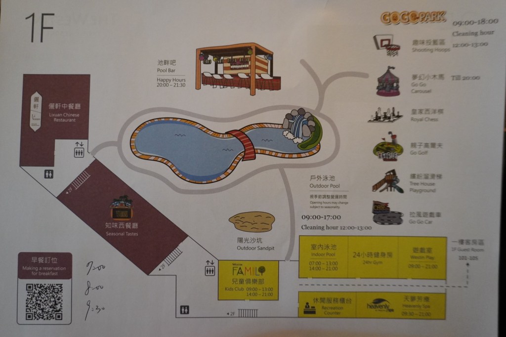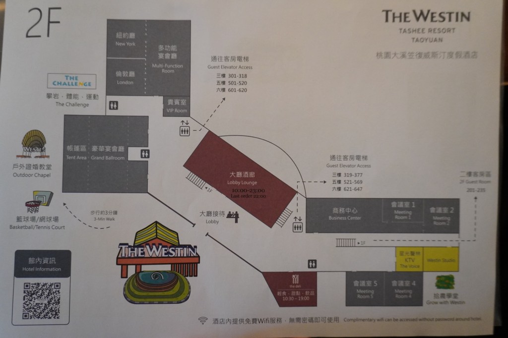 大廳所在位置在2樓,星巴克、富邦提款機、大廳酒廊、KTV、商務會議室都在這樓層,室外有籃球/網球場及攀岩運動區。其餘泳池(室內及室外)、餐廳、旋轉木馬、兒童俱樂部、親子高爾夫⋯等設施則位於1樓,部分2樓至6樓為住宿區。