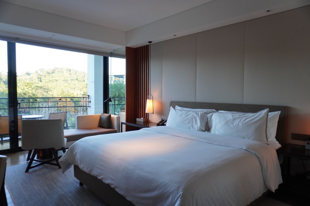 我們的房間在3樓,是面中庭的景觀房,但位置是在側邊僅能看到部分泳池,房間空間寬敞,浴室採用雙面玻璃設計讓整體空間沒有壓迫感,一覽無遺,陽台及浴室的電動窗簾都可以拉下來,隱私不減。