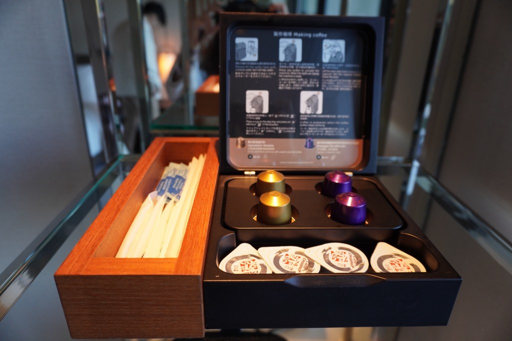 小冰箱內mini bar完全免費,還有膠囊咖啡可以自己操作,抽屜裡有咖啡杯、玻璃杯、高腳杯。