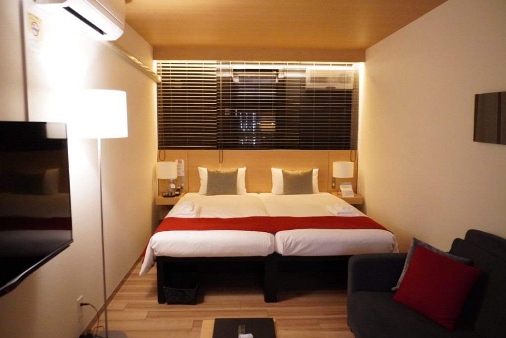 接著再往深處走就是獨立房區,有雙人房也有四人房,這裡就有共用廁所可以不用跑到浴場那邊上廁所,對於TORIFITO的整潔度我給一百分,每一處都給旅客乾淨舒適的體驗。這次我們住的是雙人房(兩張單人床併床),房內有盥洗化妝台(刷牙就不用跑出去了)、杯具、吹風機、冰箱及保險櫃,房間大小可以攤開兩的大行李箱沒問題,還有沙發跟茶几。